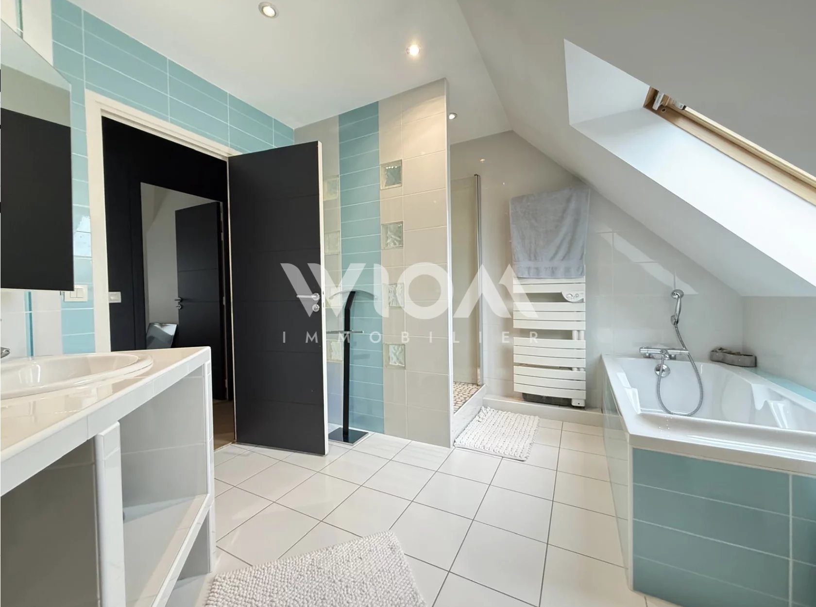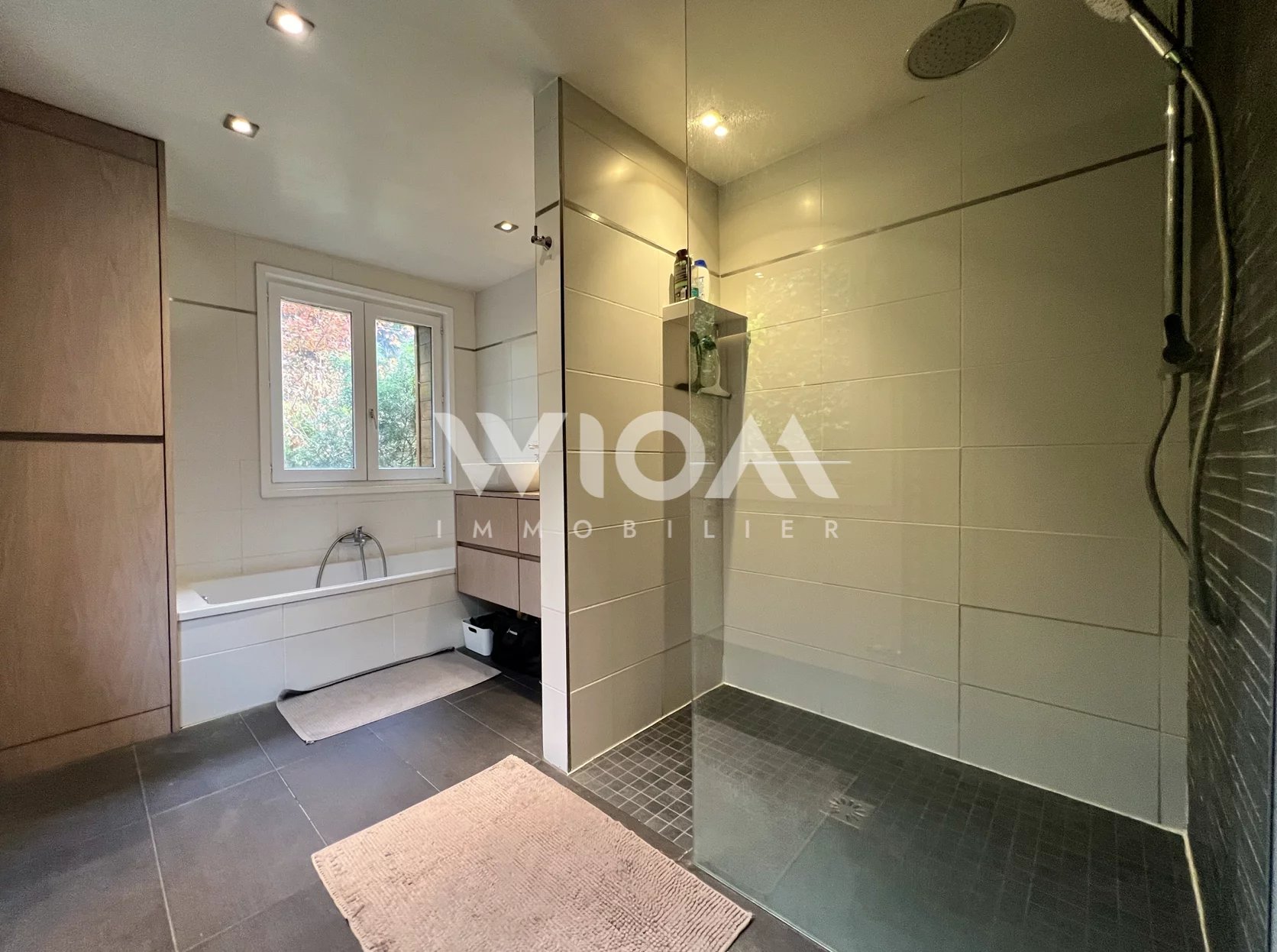 RDC : salon, salle à manger, cuisine ouverte et une magnifique verrière donnant sur le jardin de 130 m², ainsi qu’un espace buanderie et une salle de bain avec douche à l’italienne et baignoire.