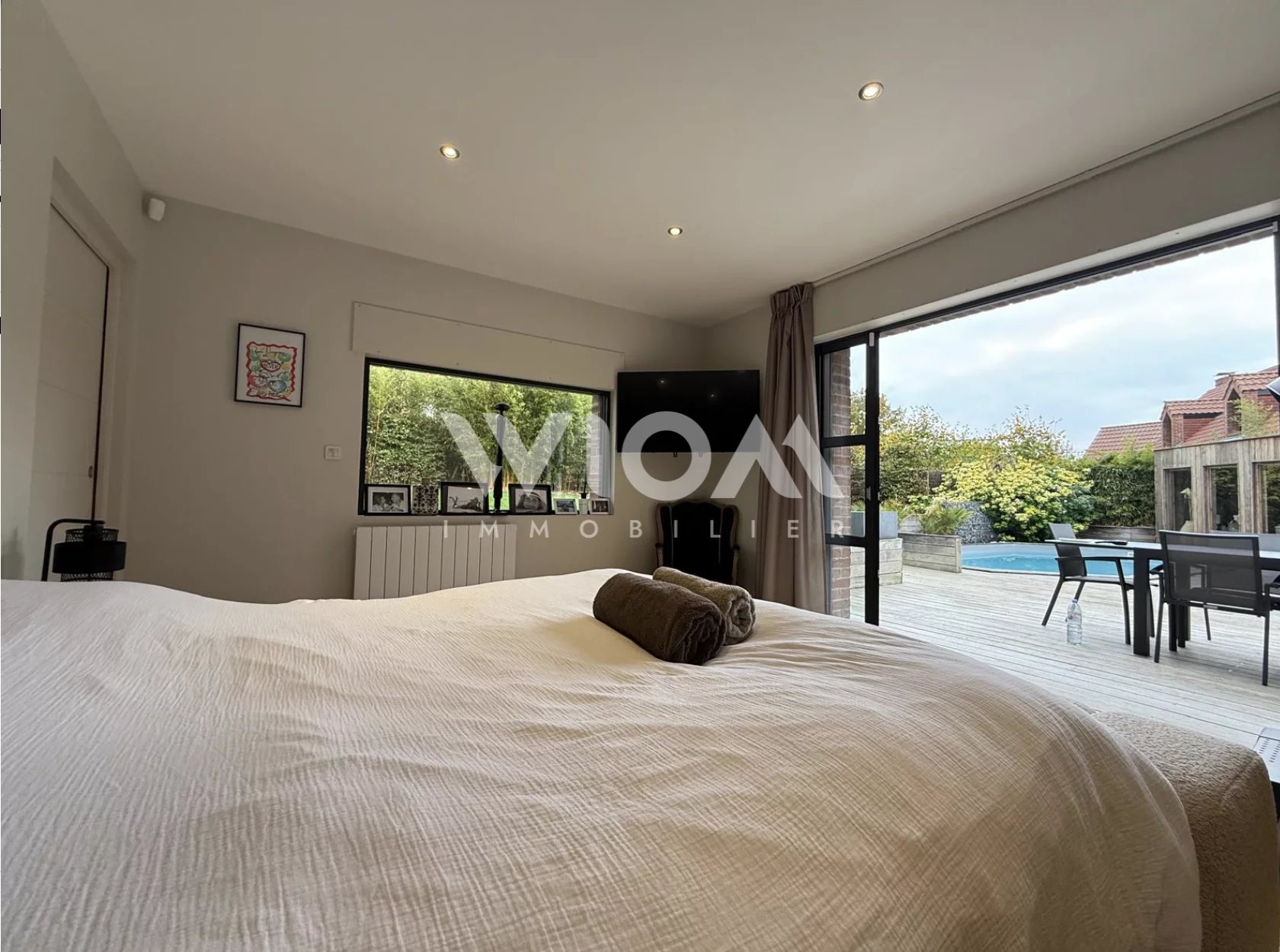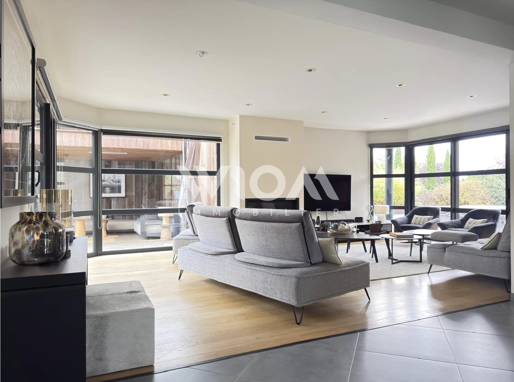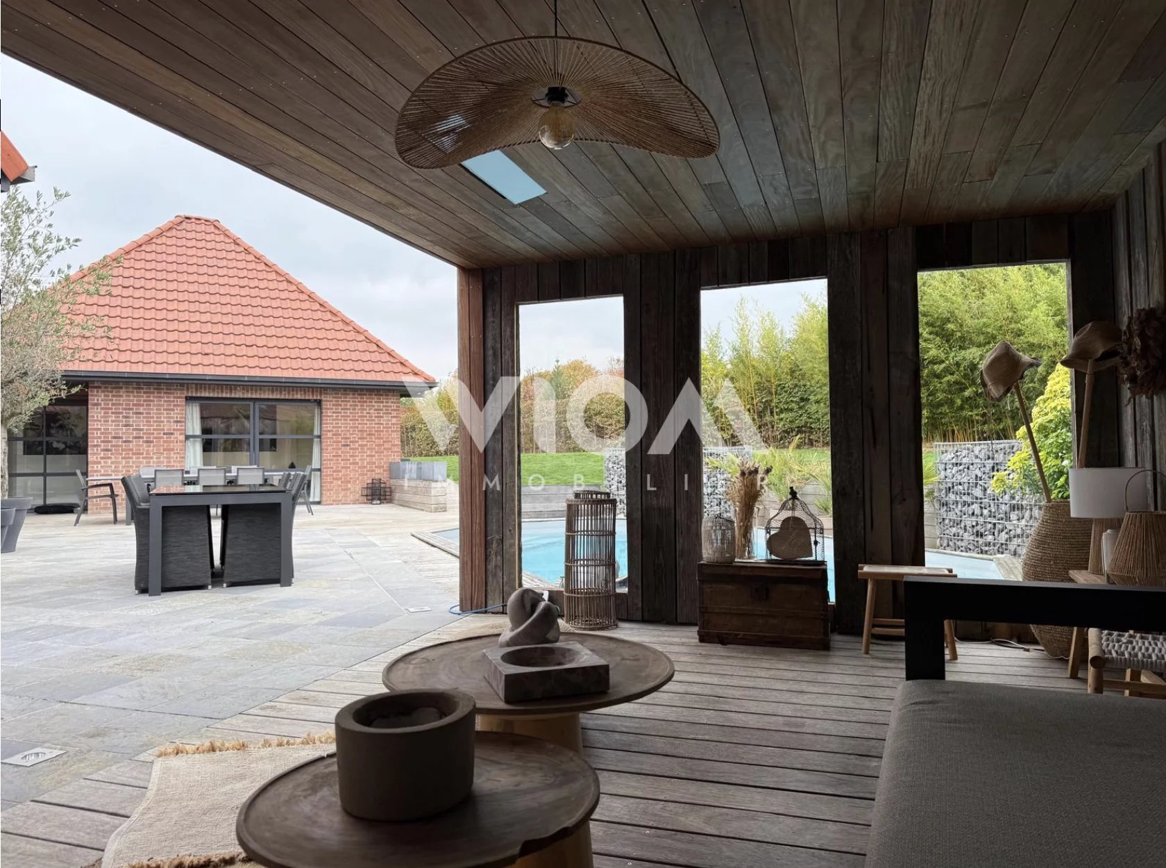 Les larges baies vitrées prolongent naturellement l’espace intérieur vers une terrasse en bois et une piscine, invitant à la détente et à la convivialité.