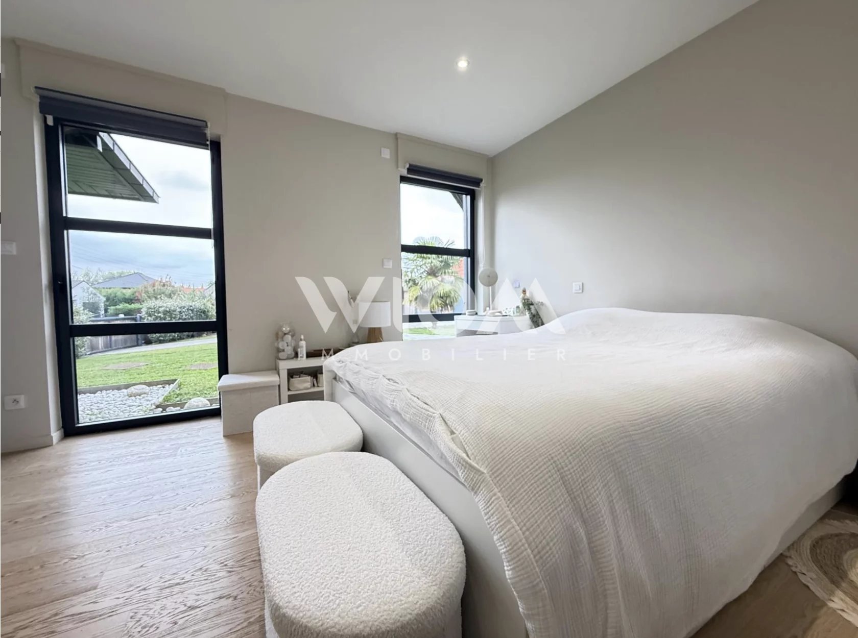 En entrant par le portail motorisé, vous découvrez une petite cour qui mène au jardin et à la maison. Le rez-de-chaussée se compose d'un grand salon-séjour, baigné de lumière, qui dessert une cuisine moderne et une arrière-cuisine. Une pièce d'eau avec dressing ajoute confort et praticité. La grande extension abrite un bureau spacieux avec vue plongeante sur le jardin, menant directement à une suite parentale luxueuse, équipée d'une baignoire balnéo, d'une salle d'eau et d'une vasque.