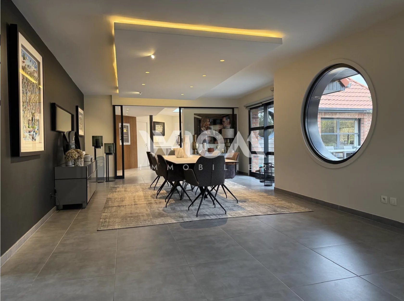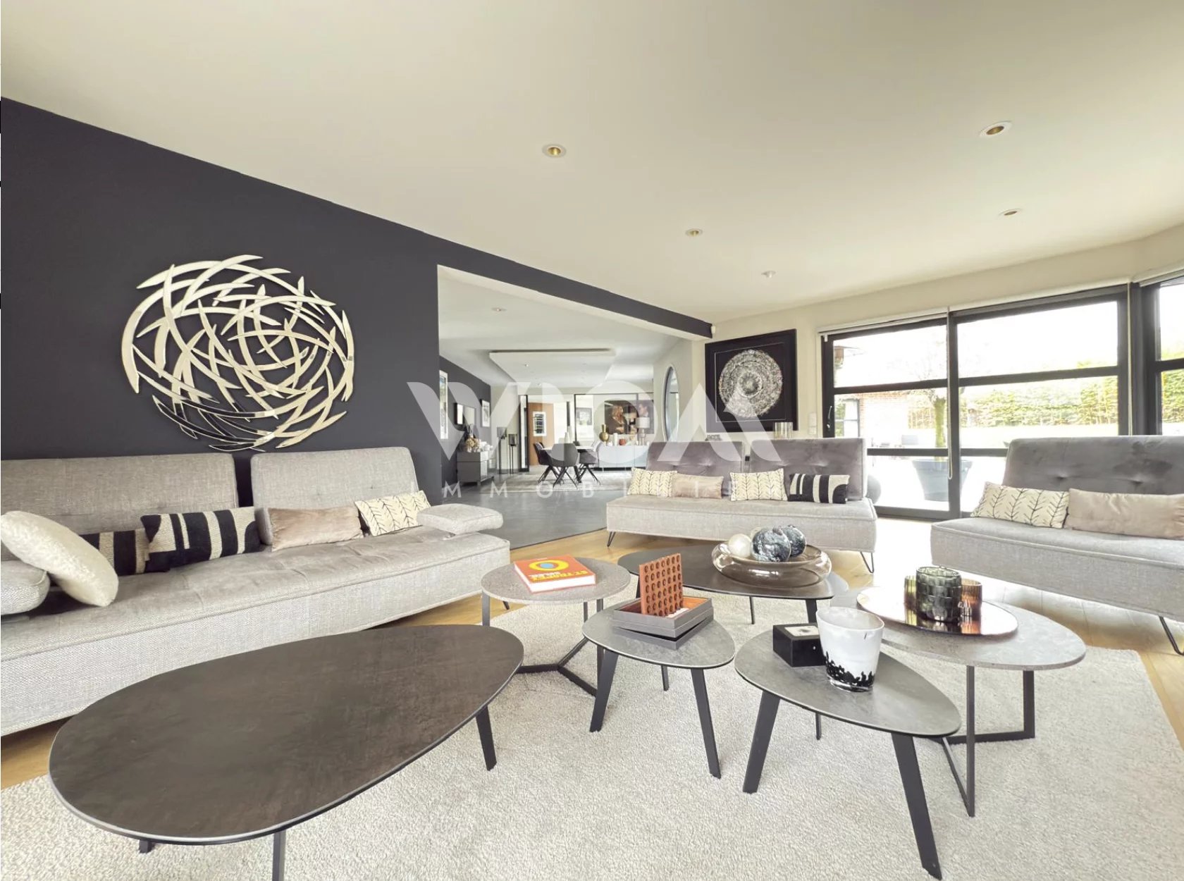 La pièce de réception, lumineuse et ouverte sur le jardin, s’organise autour d’un salon convivial, d’une salle à manger raffinée et d’une cuisine contemporaine au design épuré.