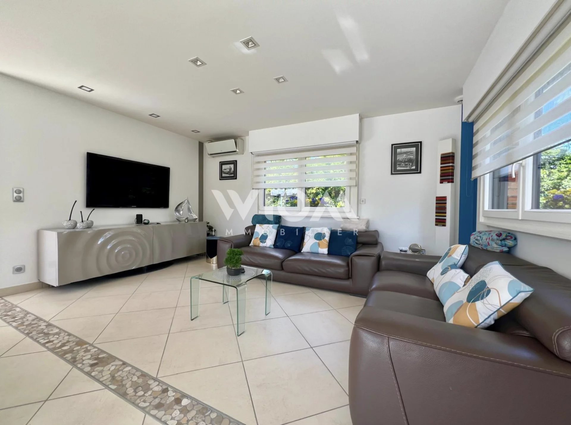 • Une pièce de vie impressionnante, baignée de lumière grâce aux grandes baies vitrées donnant sur le jardin. Ambiance design, lignes épurées, plafonds travaillés, éclairage LED intégré : un vrai coup de cœur pour les amateurs de belles finitions.