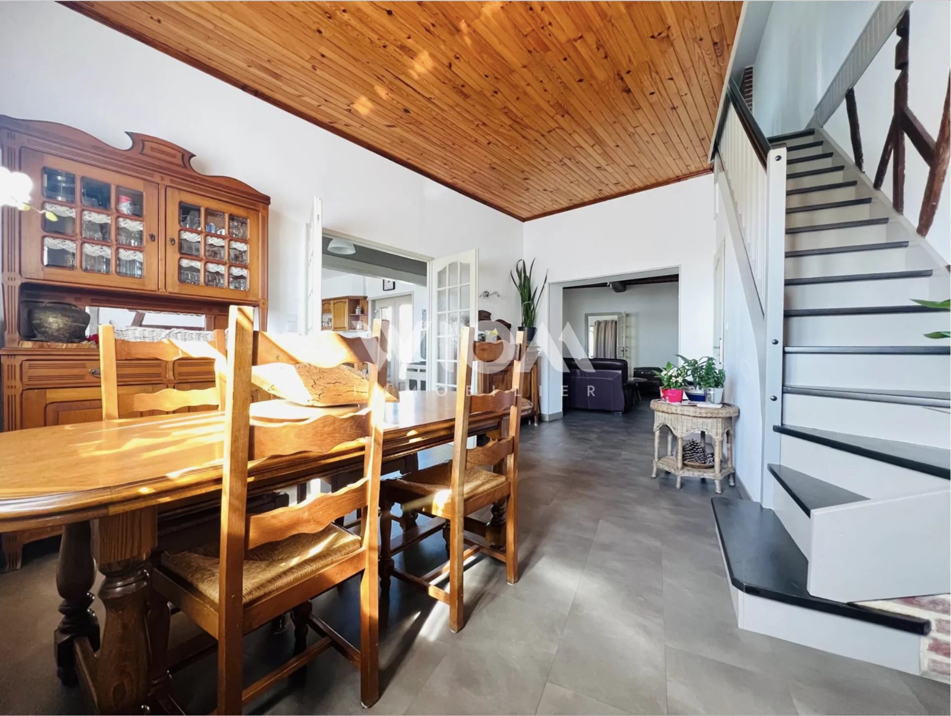 La maison se compose d’un vaste séjour baigné de lumière, sublimé par une cheminée, idéal pour vos moments de détente. La salle à manger, ouverte sur les extérieurs grâce à ses nombreuses fenêtres, offre un espace convivial pour recevoir famille et amis.