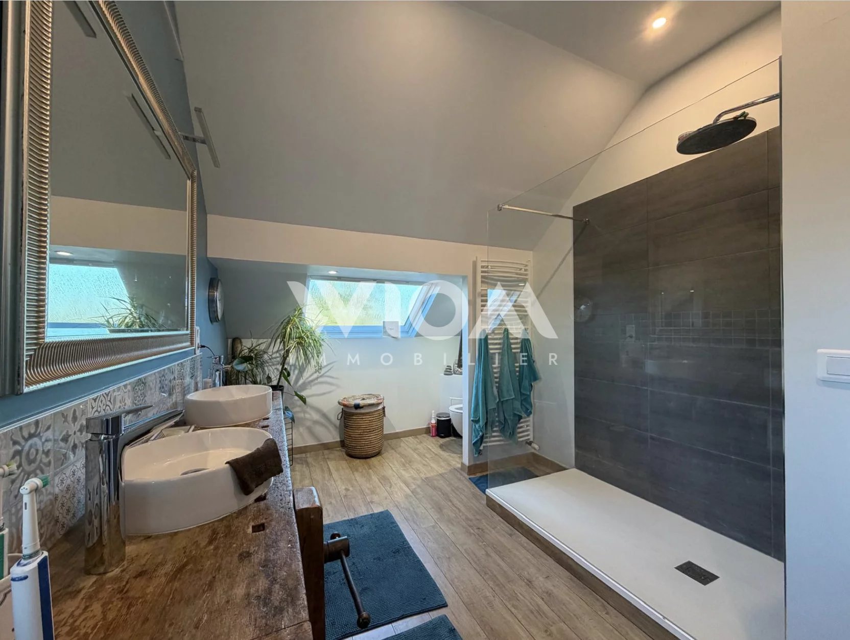 La maison se compose d’un vaste séjour baigné de lumière, sublimé par une cheminée, idéal pour vos moments de détente. La salle à manger, ouverte sur les extérieurs grâce à ses nombreuses fenêtres, offre un espace convivial pour recevoir famille et amis.