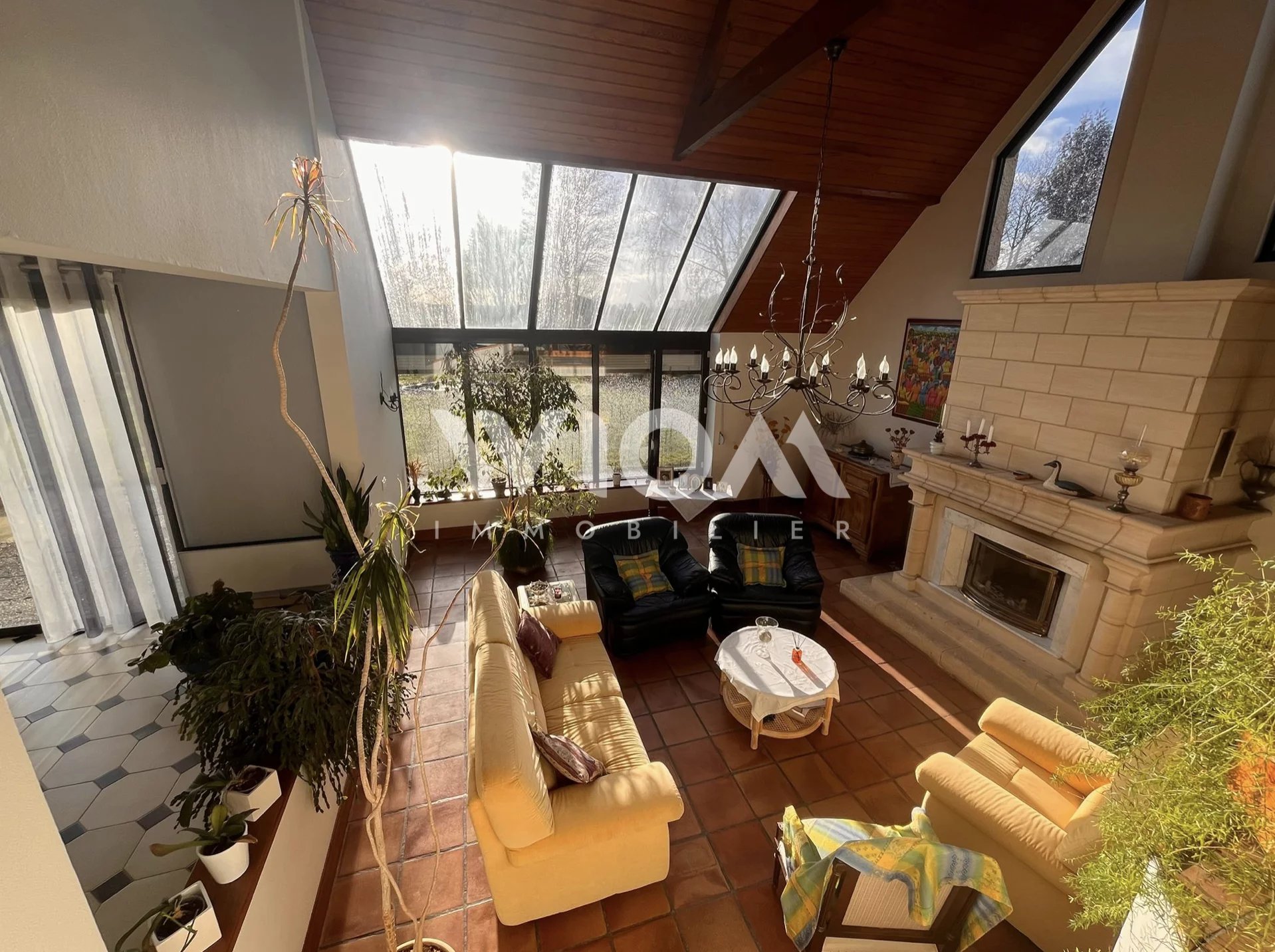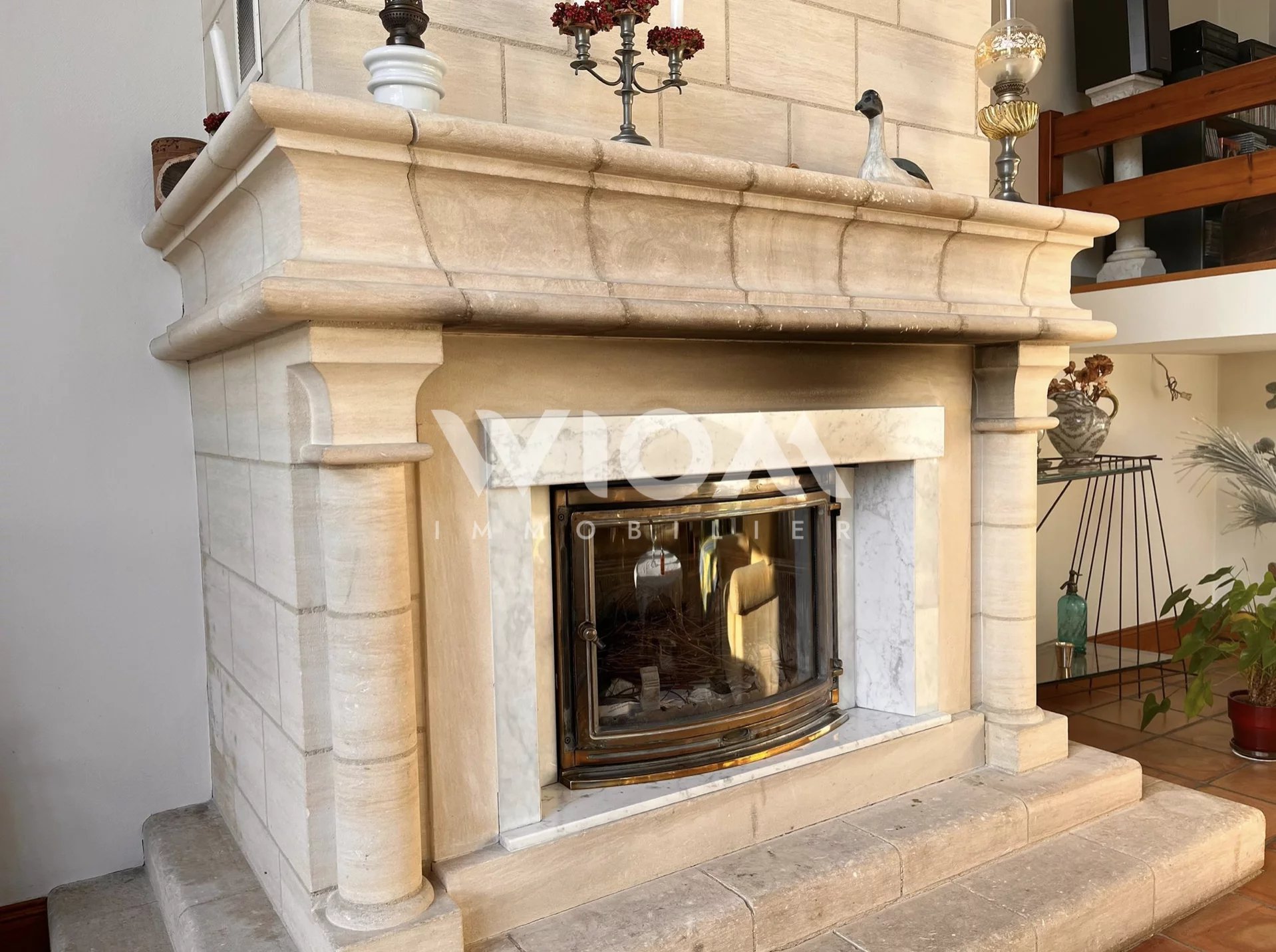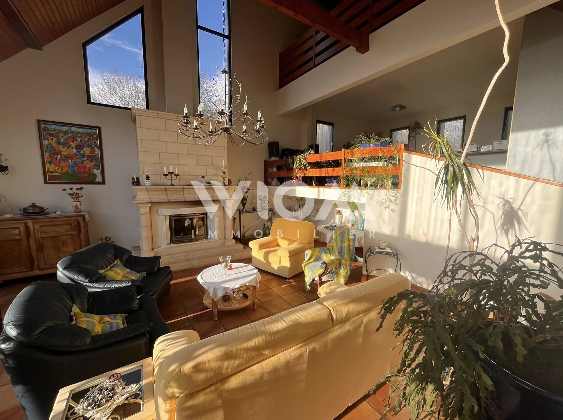 Dès l’entrée, vous serez séduits par les espaces de vie lumineux et la hauteur sous plafond impressionnante du séjour, sublimé par une cheminée centrale qui apporte charme et convivialité.