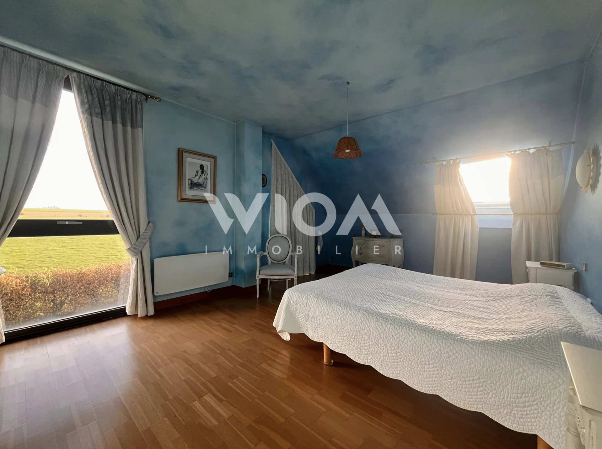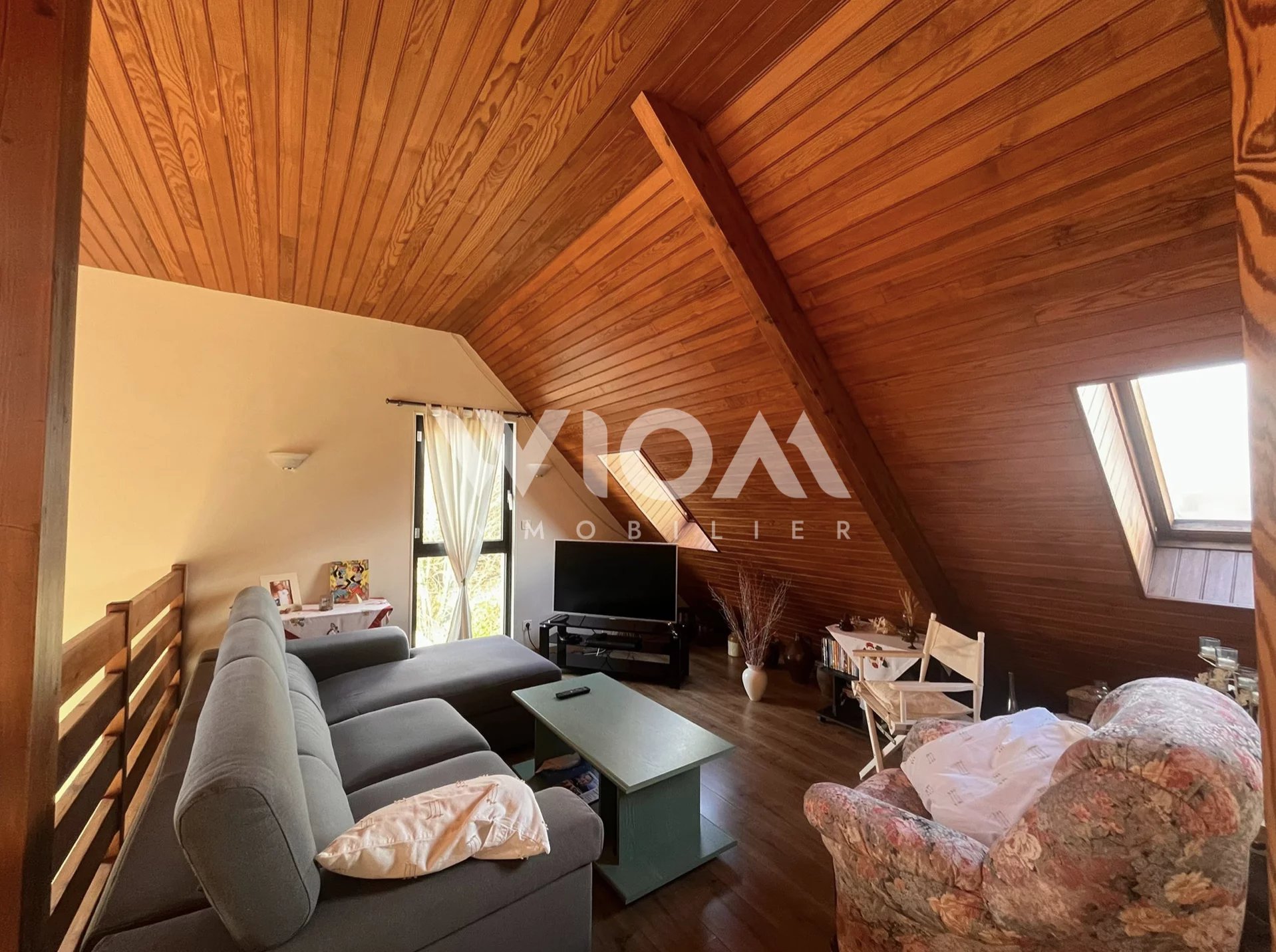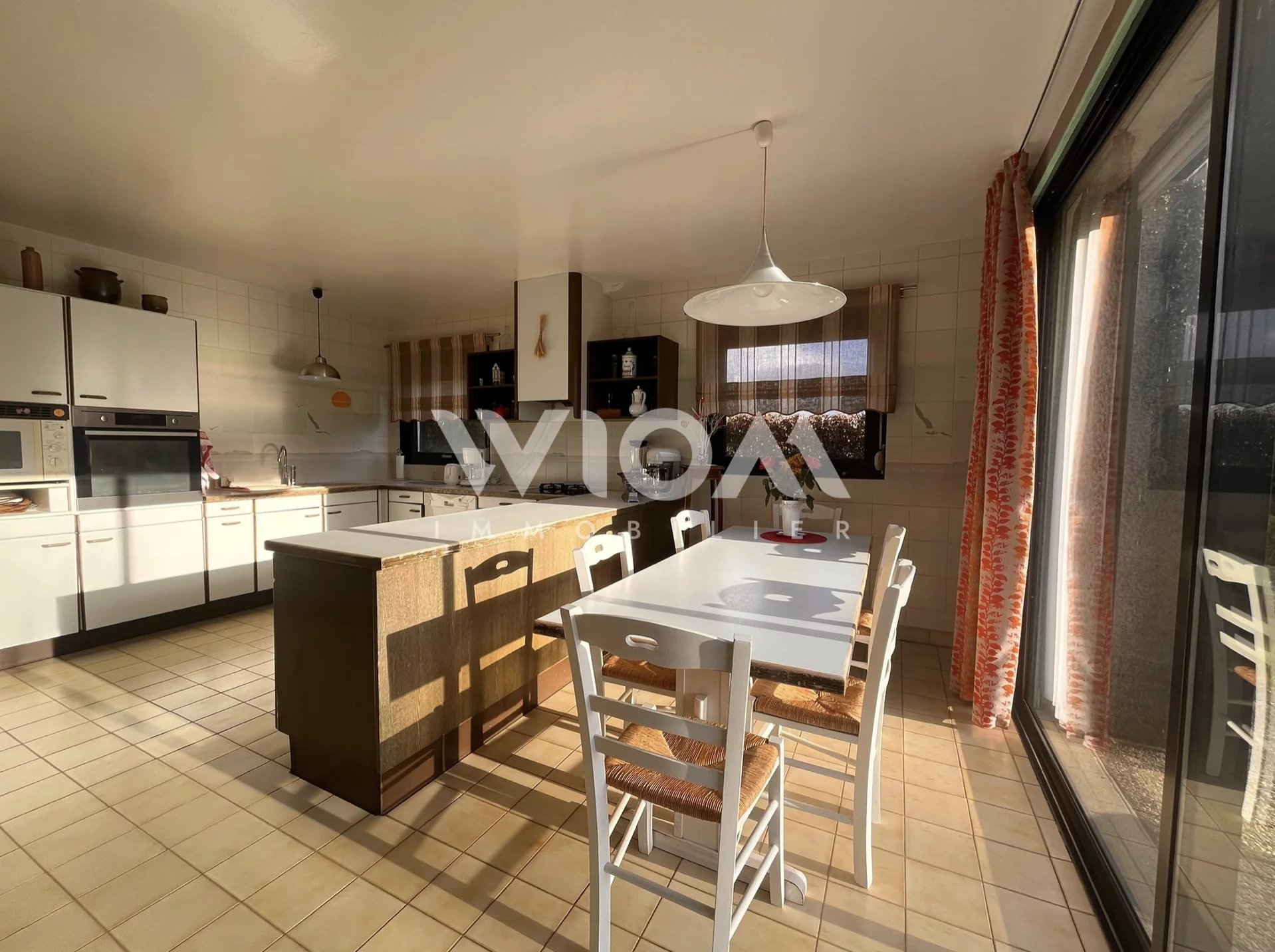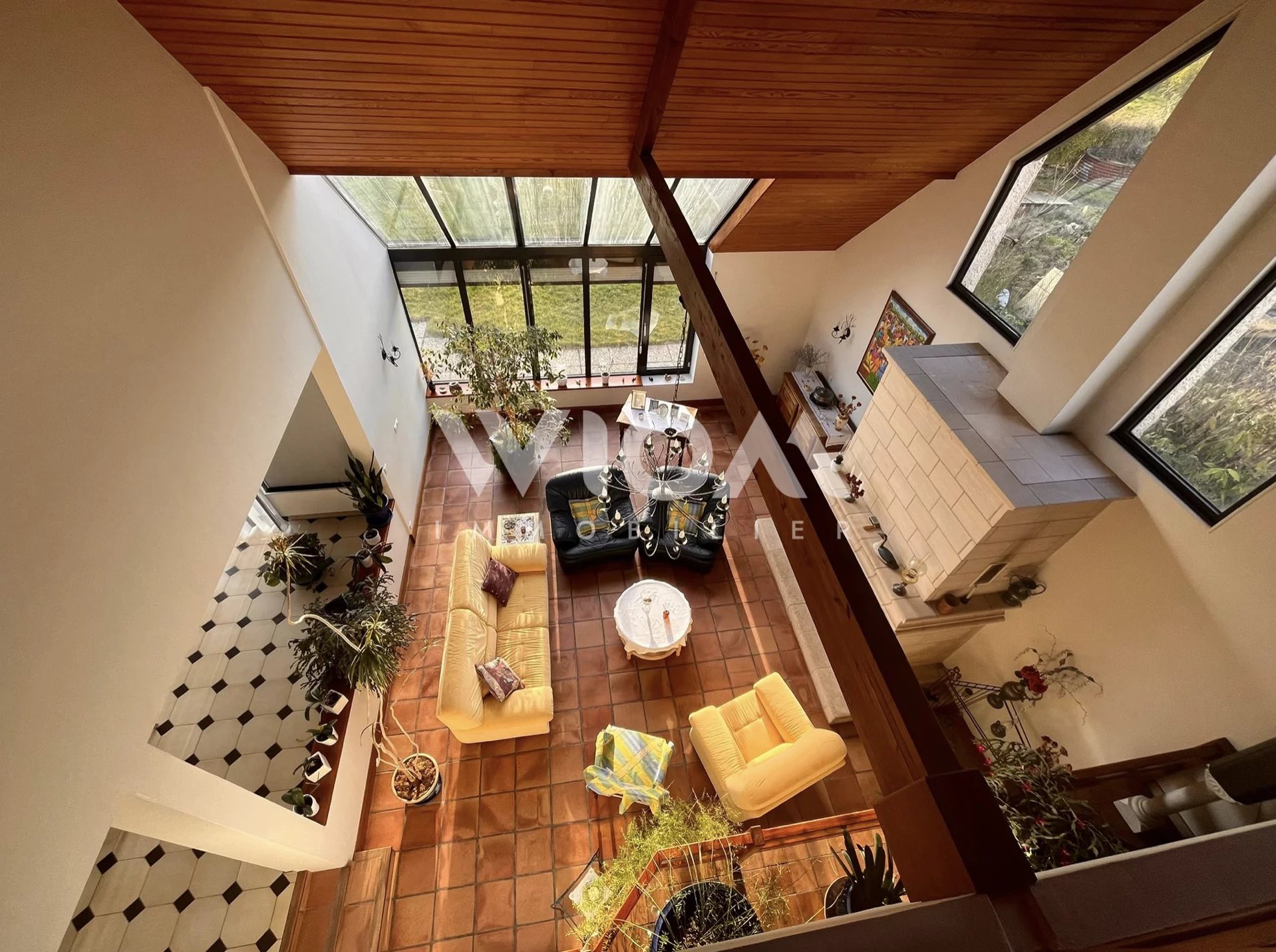 Dès l’entrée, vous serez séduits par les espaces de vie lumineux et la hauteur sous plafond impressionnante du séjour, sublimé par une cheminée centrale qui apporte charme et convivialité.