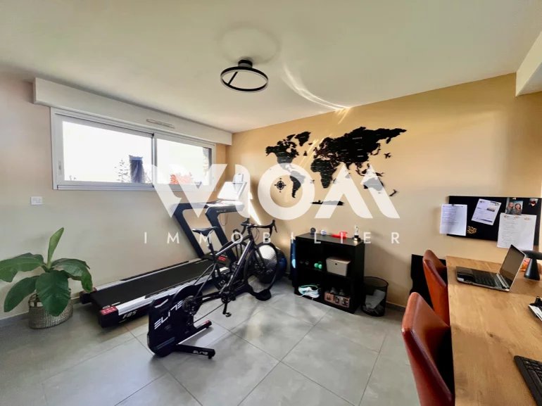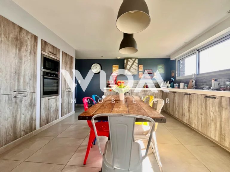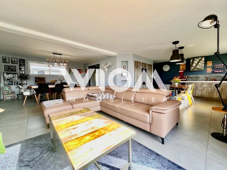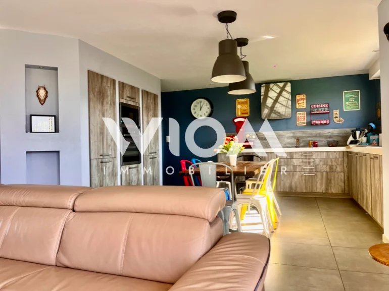 Grande pièce de vie séjour / salon très lumineuse avec grandes ouvertures donnant sur une terrasse exposée sud-ouest, cuisine équipée et aménagée, 1 chambre, salle d’eau, WC et accès aux 2 garages avec portes motorisées.